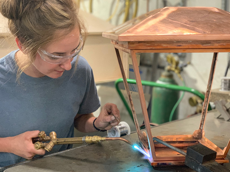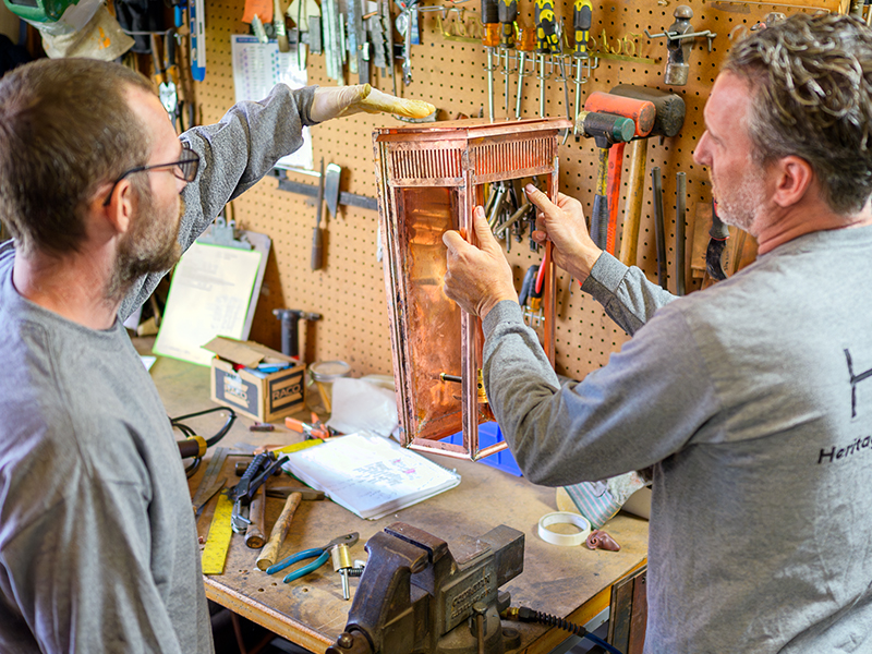Heritage Metalworks offers two historically inspired lighting lines, Scofield Lighting and Heritage Traditions Lighting. With our in-house tin shop, blacksmith shop, and foundry, these authentic reproductions are made by hand, using original tools, methods, and finishes. Over 200 iron, brass, copper, and tin designs are available with unlimited personalization options. Copper and tin components are made using ancient practices that allow us to produce strong, durable lighting, made to last the elements of time. Iron fixtures are hand forged and sometimes enhanced with cast brass components showing the beauty and character of mixed metals. Brass fixtures are cast by melting brass, pouring into special molds, then assembling with precise detail.