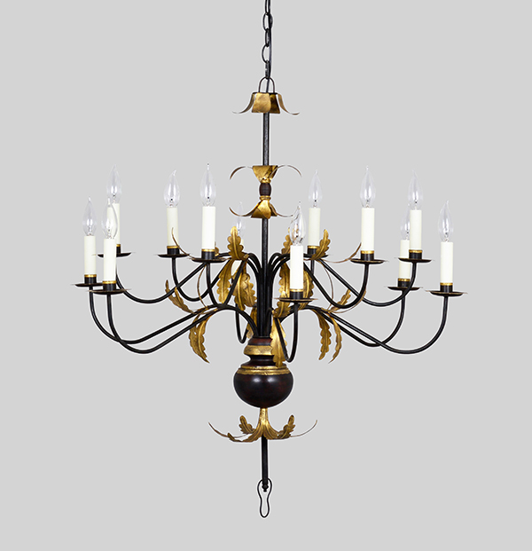 This double tiered version of our Acanthus Leaf Chandelier features hand-applied Gold leaf on delicately cut leaves with wood turned centers and decorative hand cut bobeches.