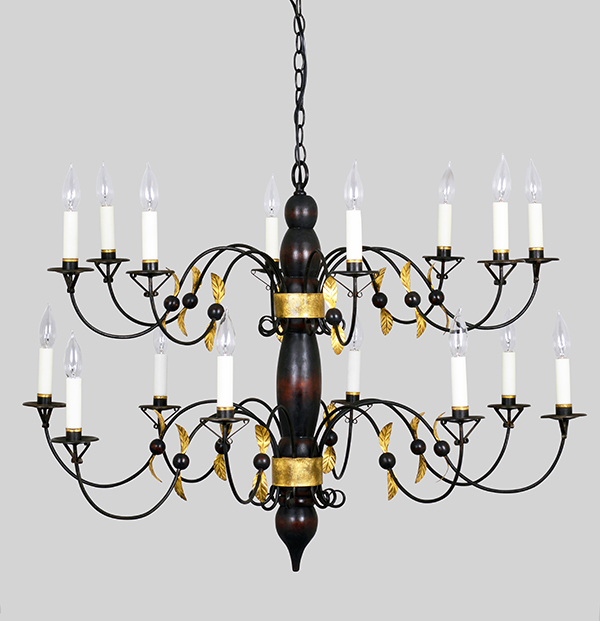 Found in New England Meeting House where they were the sole source of light, this early 19th century chandelier features a wooden hand-turned center, ornamental wooden balls, ornamental bobeches and hand-applied Gold leaf on delicate leaves.