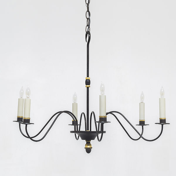 This bold spin-off of the French Single Tier Chandelier combines a simple, airy structure with detailed wood turnings, a spun platform, and a suspended knop, all finished with a hint of gold leaf.