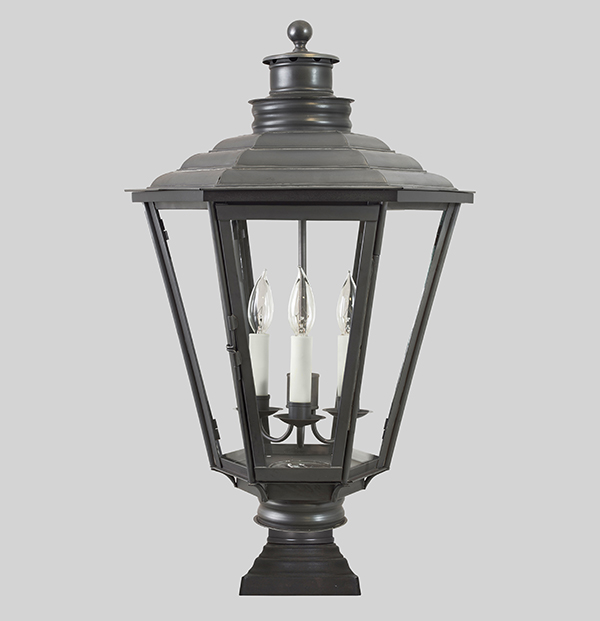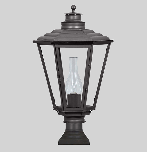 After the development of gas lighting in England, governments were required to light the streets. This fixture is inspired by an early 19th century hanging lantern found in England and is accompanied by a 3″ post collar.