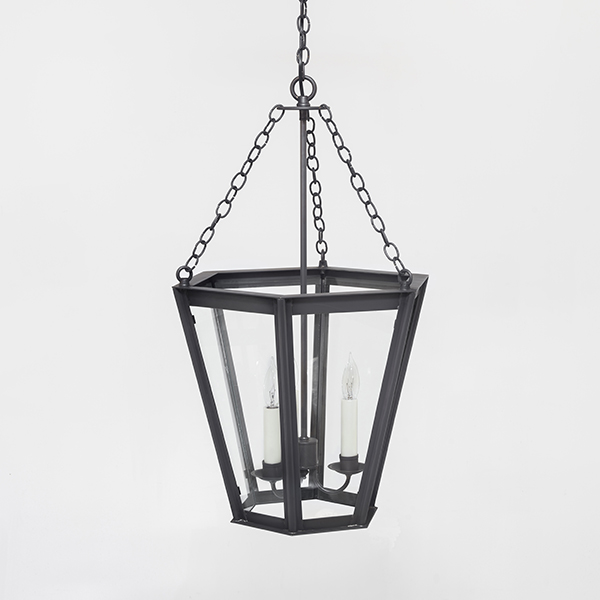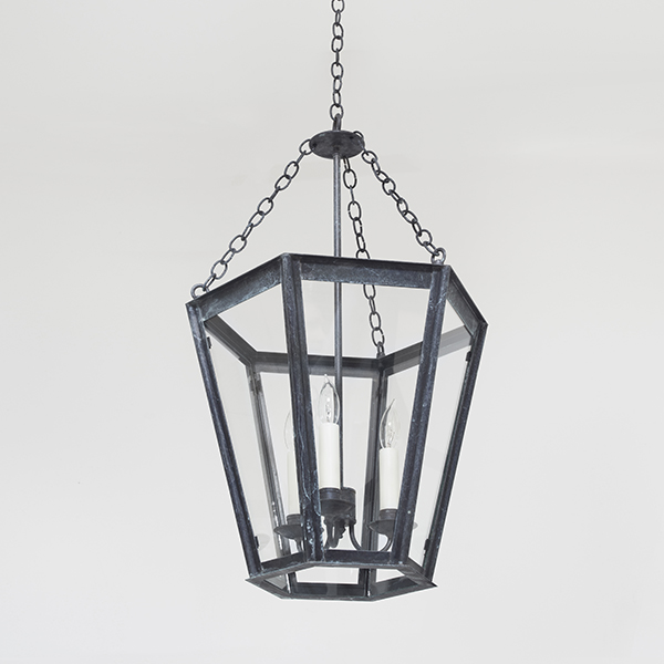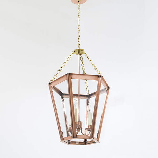 This airy adaption of the popular English Gas Lantern is a 19th century traditional mixed-metal fixture suspended by brass chain and copper body, surrounded by 6 panes of glass.
