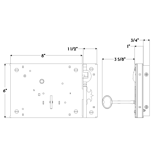 Large forged iron horizontal carpenter lock with fixed key.