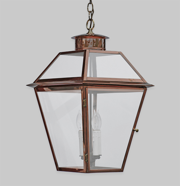 The thin lines and large panes of this handmade copper hanging lantern provide excellent broadcast lighting in a classic styled lantern.