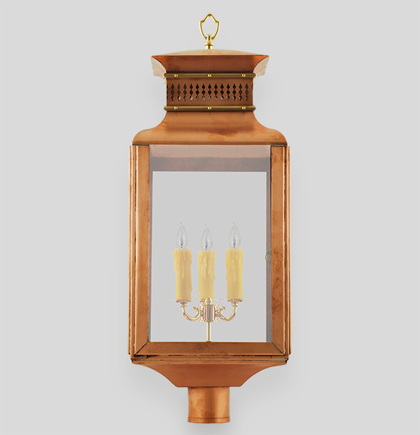 Hand-hammered from copper, this post lantern features cast brass arms surrounded by antique restoration glass, accompanied by a 3” post collar.