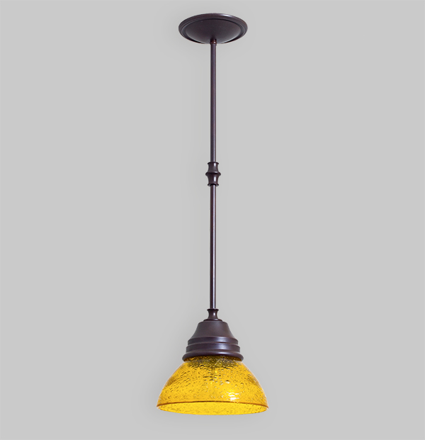 This hand formed brass pendant is fashioned with hand-blown seeded glass, a spun glass holder and turned knuckles.