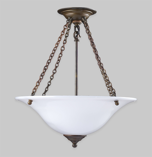 Suspended from a custom brass chain, this two lamp pendant combines hand-blown opal glass with cast brass details.