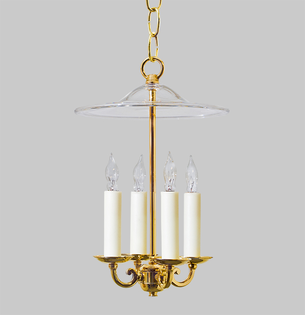 Connected only by a single brass shaft, this unique pendant successfully merges a hand-blown glass cowl and a four-light candelabra made with cast, split-seam arms.