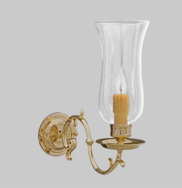This historically accurate single arm reproduction of a traditional English wall sconce with a hurricane shade is solid cast with discrete electrification.