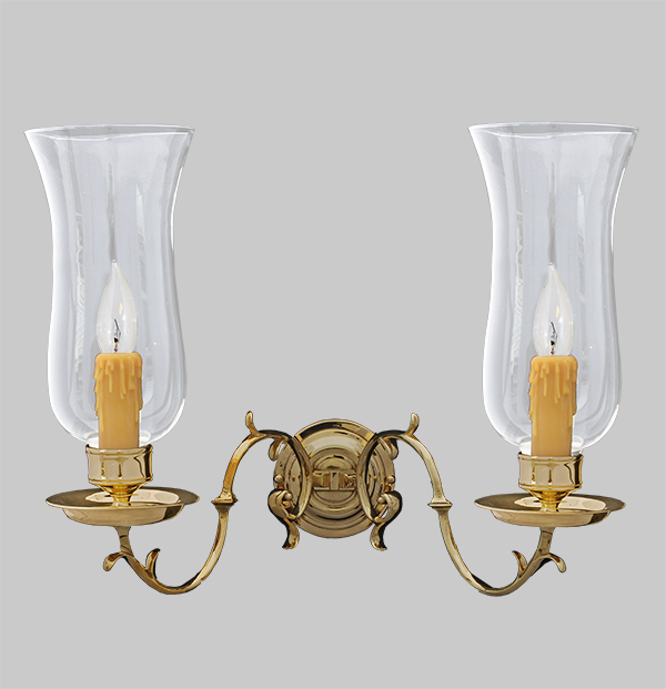 This historically accurate double arm reproduction of a traditional English wall sconce with hurricane shades is solid cast with discrete electrification.