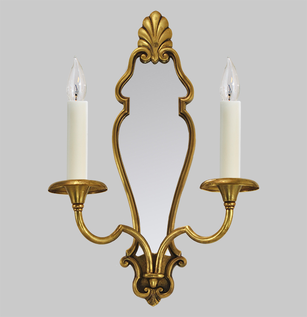 With formed hollow arms and hand-spun bobeches, the backplate of this handmade sconce is cast in brass, framing the mirrored glass.