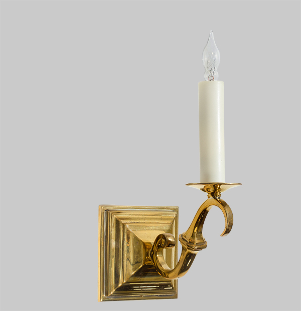 This single armed sconce is handcrafted entirely from brass, combining a cast backplate and cast two-part, split-seam arms.