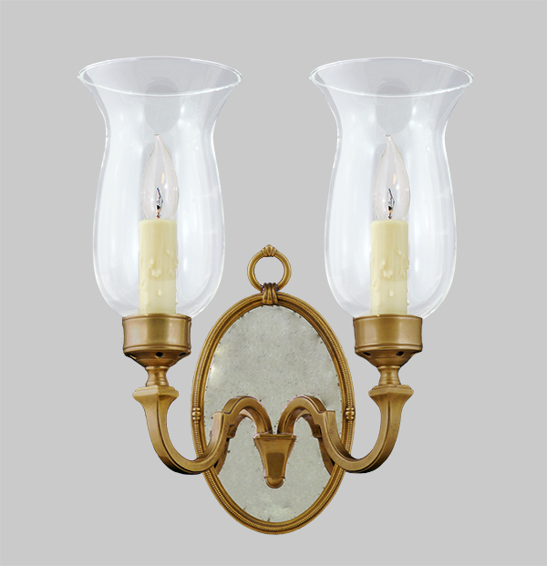 This fine quality, handcrafted double arm sconce combines antiqued mirror glass, cast split-seam arms, a cast frame, and hurricane shades.