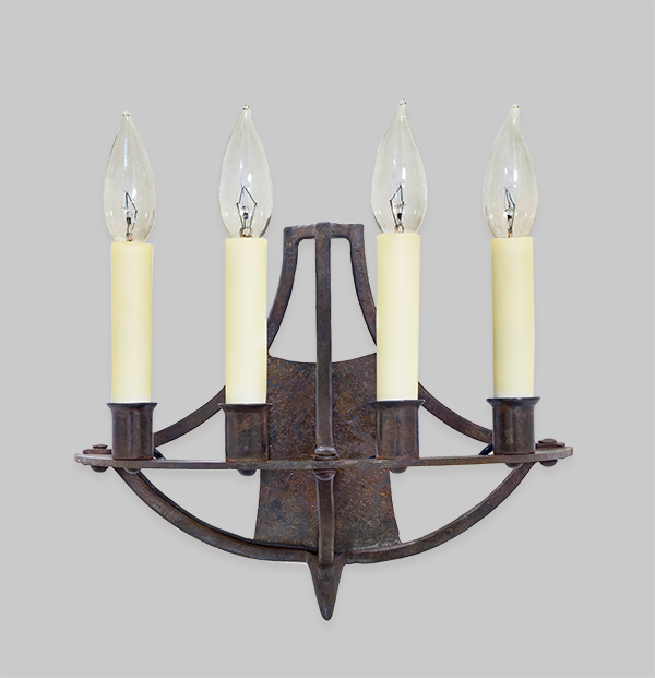 This forged, wall mounted adaptation of the Spatterware Hall Chandelier, shines ample light with four candles perched on a semi-circular band, nestled into candle cups and electrified by nearly invisible wiring.