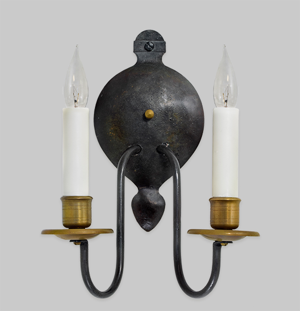 This historically inspired double arm sconce combines a hand forged iron backplate with brass details including turned candle cups and hand-spun bobeches.