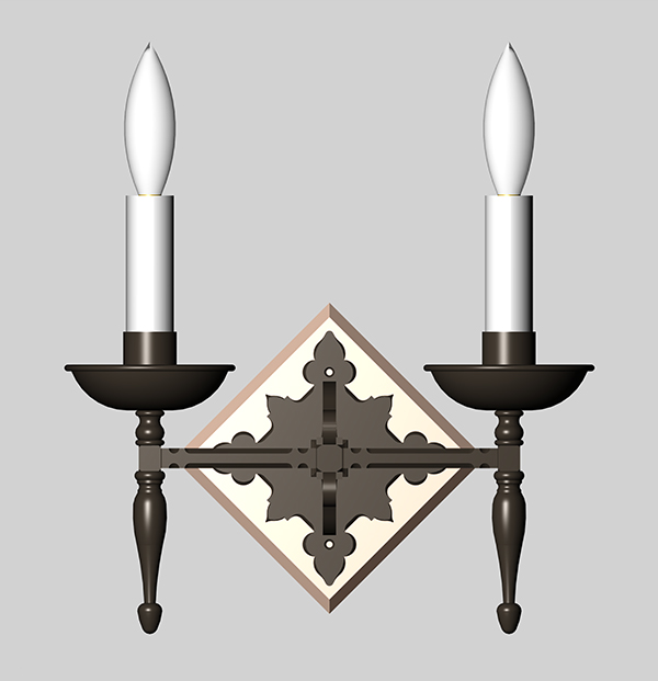 This unique, double arm gothic style iron sconce is hand forged with precise attention to detail and mounted onto a wooden backplate.