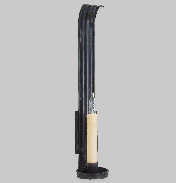 Enhanced by detailed ripples in the long tin backplate, this single candle sconce is a hand formed reproduction of an original design from the Winterthur Estate.